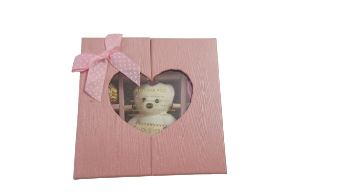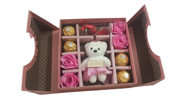 Pink Heart Shaped - The box contains 4 pieces of Ferrero Rocher,some artificial pink fragrance flowers,Message bottle and a small snowy doll in the centre.