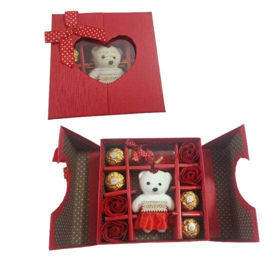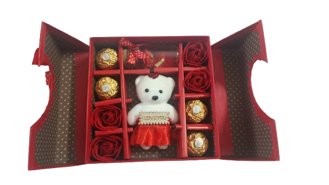 The box contains 4 pieces of Ferrero Rocher,some artificial fragrance flowers,Message bottle and a small snowy doll in the centre.