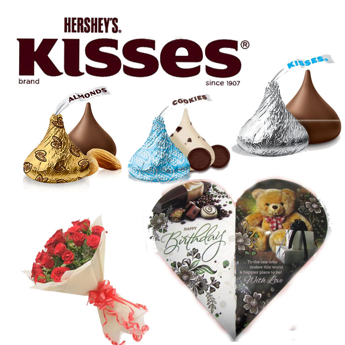 Kisses Chocolate,Red Rose Bunch and Heart Shaped Birthday Card